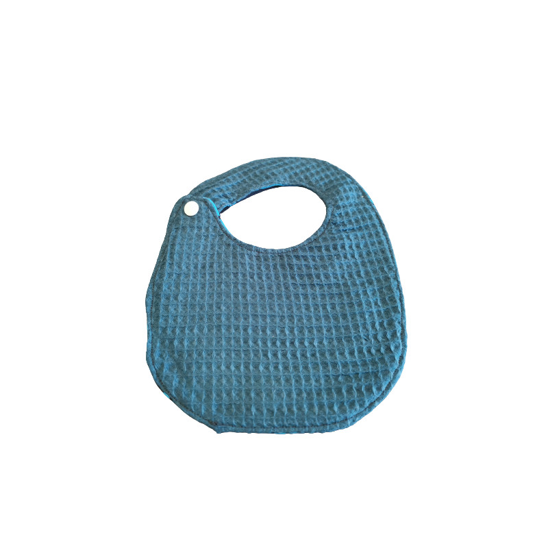 Un coté très tendance et un coté éponge absorbant en nid d’abeille. Les bavoirs sont maintenus par une pression.