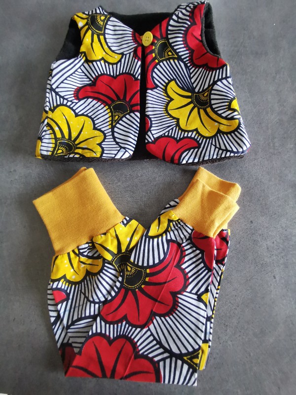 Gilet de berger pour enfant en coton wax fleur de mariage et intérieur en polaire noir très doux et tiens chaud.