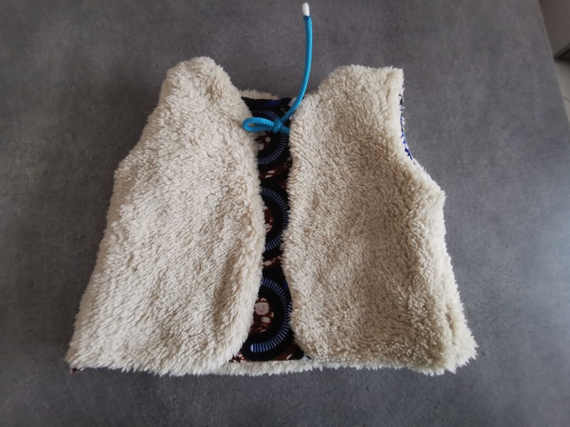 Gilet de berger Wawa pour enfant en coton wax bleu avec et intérieur en polaire effet mouton.