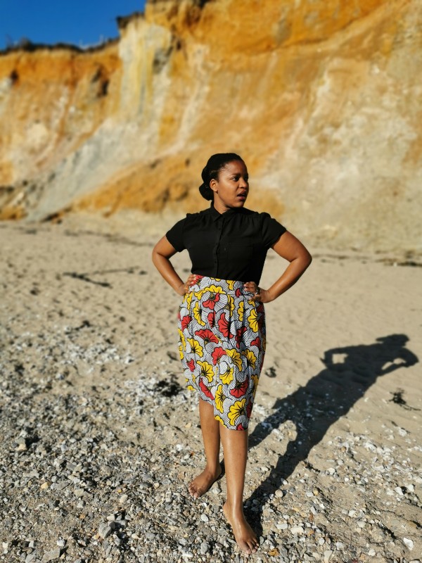 La jupe évasée en Wax est une pièce tendance pour les beaux jours mais aussi pour l’automne accompagnée de collants.