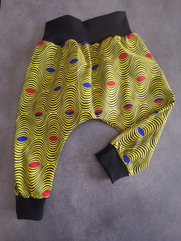 Entièrement cousu à la Surjeteuse. Le sarouel est dit évolutif car il s’ajuste au niveau de la taille et au niveau des chevilles en repliant ou dépliant les bandeaux de tissus (appelés bord côte) sur eux-mêmes.