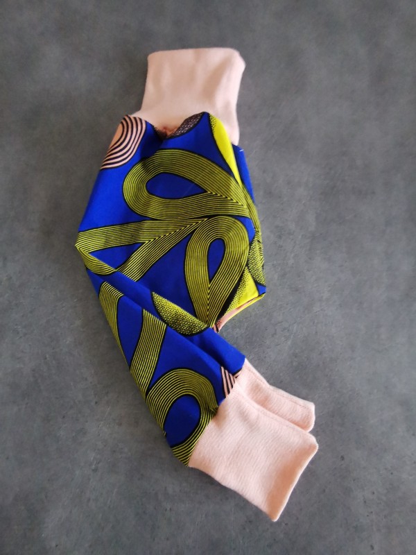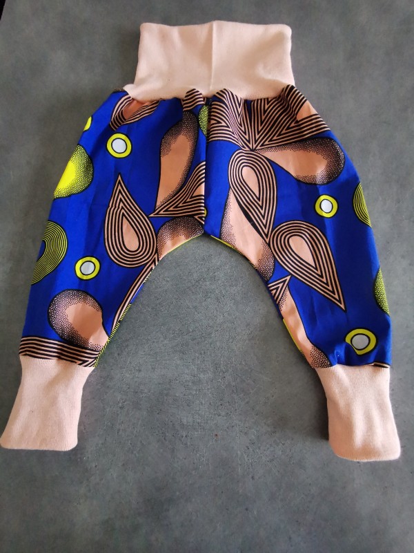 Sarouel wax évolutif grâce à sa taille et ses chevilles stretch en coton bio à retourner suivant la croissance.