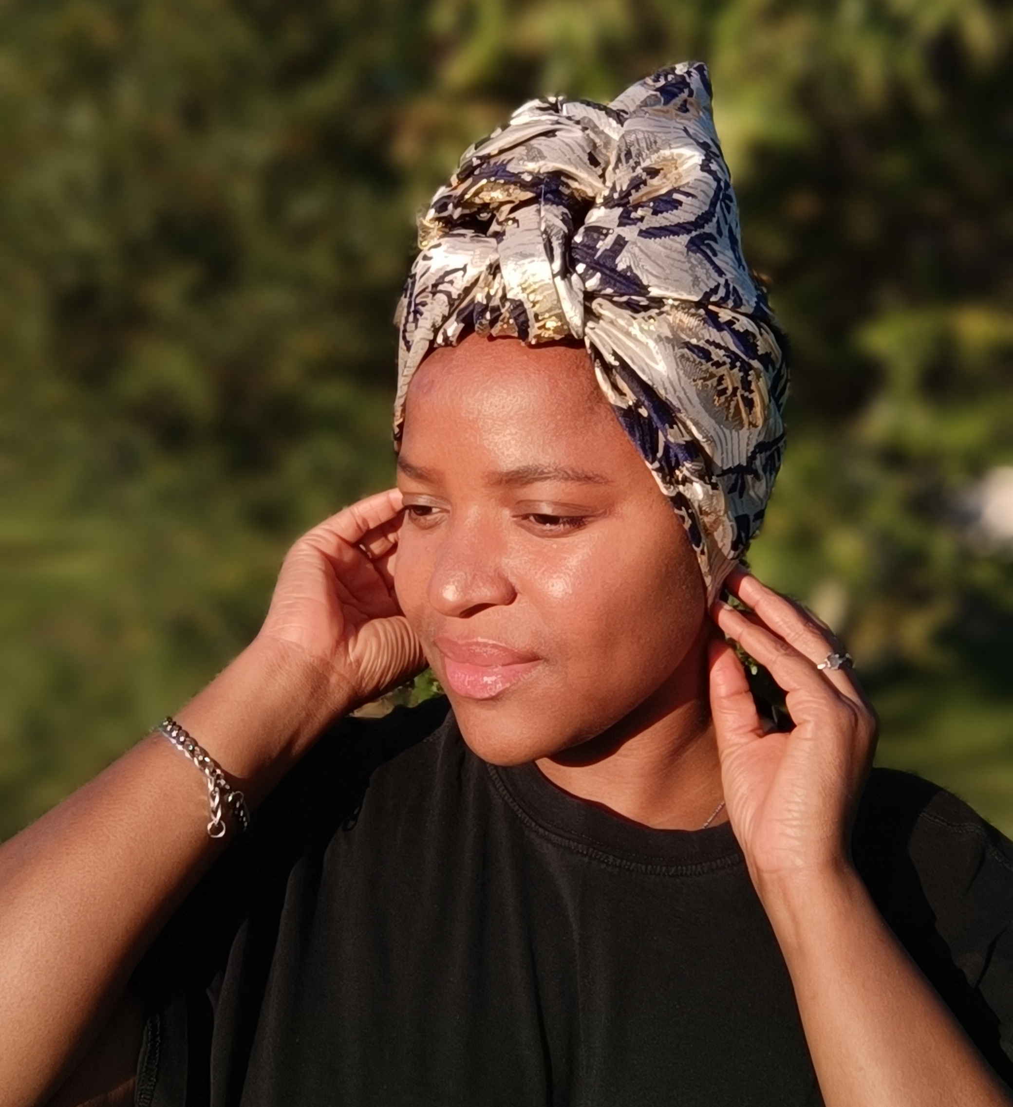 Ce turban Chic bleu convient à toutes les textures de cheveux : crépus, bouclés, lisses ou locksés. Il est également idéal pour les femmes en transition capillaire, en période de repos capillaire ou en traitement médical.
